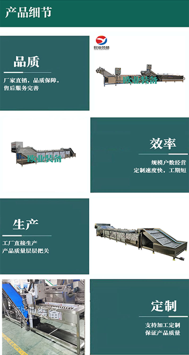 漂燙加工流水線的工藝流程通常包括以下幾個(gè)步驟:清洗、挑選、去皮、切割、蒸煮漂燙、冷卻、瀝水、風(fēng)干、包裝等。具體操作過(guò)程中,物料會(huì)經(jīng)過(guò)不同的機(jī)械裝置,如氣泡發(fā)生裝置、自動(dòng)溫控裝置、溢流裝置、加熱裝置、清洗裝置等,以確保每個(gè)環(huán)節(jié)都能高效、均勻地完成。
