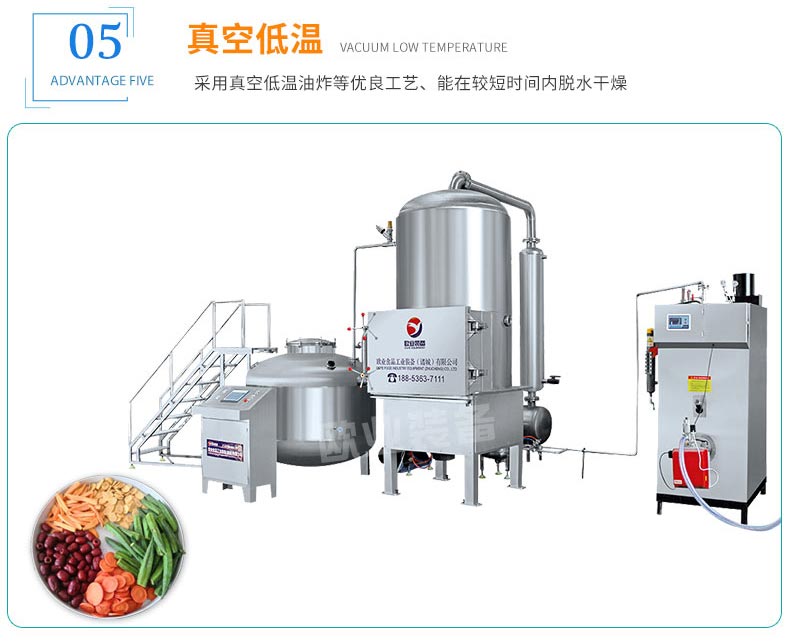 真空低溫油炸設備組成:真空油炸罐、油加熱系統、真空系統、儲油補油系統、氣動系統、自動脫油系統