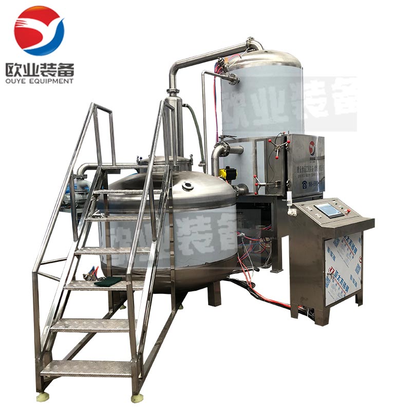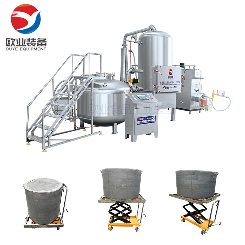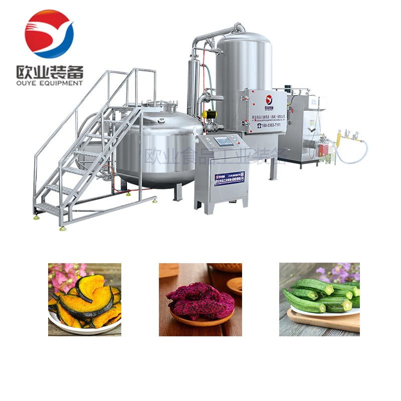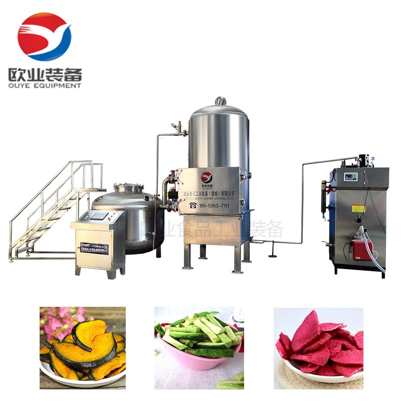 真空低溫油炸設備組成:真空油炸罐、油加熱系統、真空系統、儲油補油系統、氣動系統、自動脫油系統